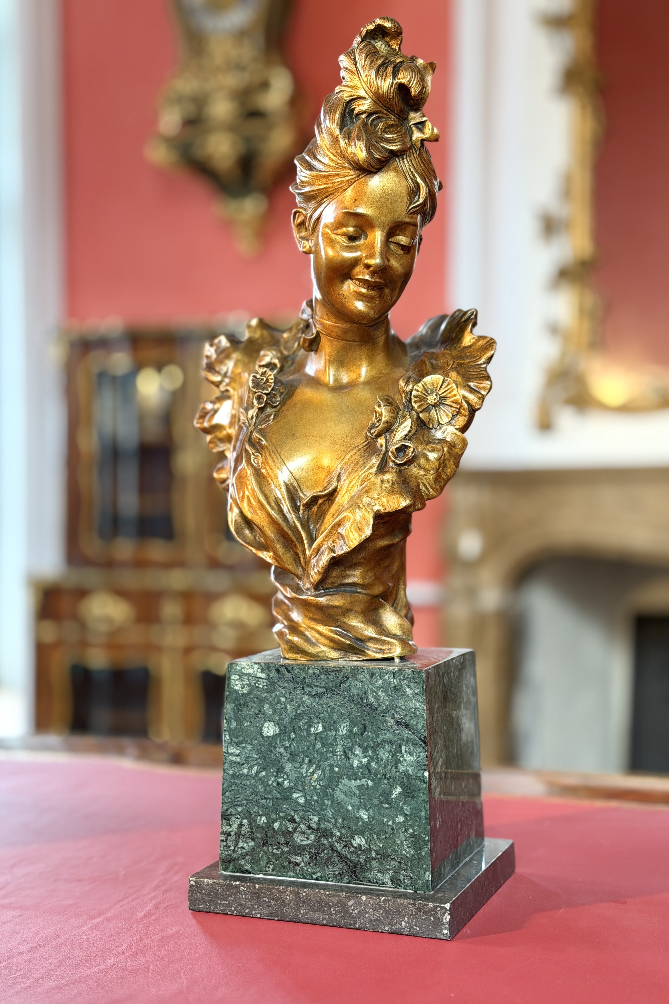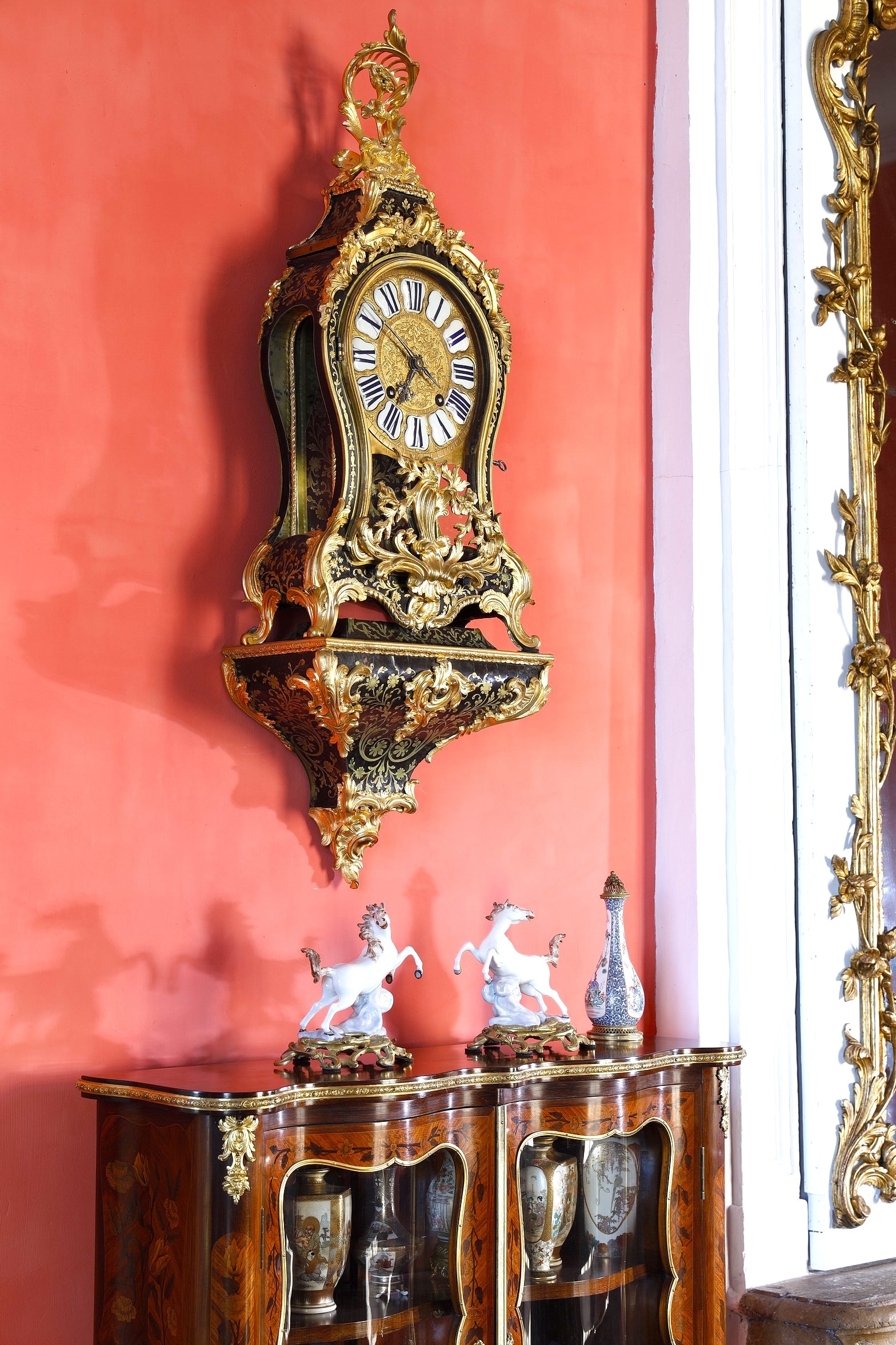 Im Zentrum dieses Raumes, der sich durch seinen unverkennbaren Rokoko-Stil auszeichnet, steht ein prächtiger, freistehender Schrank im flämischen Stil. Seine dunklen Farben bilden einen perfekten Kontrast zur verschnörkelten Dekoration und harmonieren wunderbar mit den beiden vergoldeten Holzsäulen, eine im Ludwigs XIV , die andere im Stil der Regency-Zeit Balusterleuchter und ein Paar vergoldeter Kaminböcke aus Bronze, die auf dem Schrank platziert sind, weiter geschmückt
